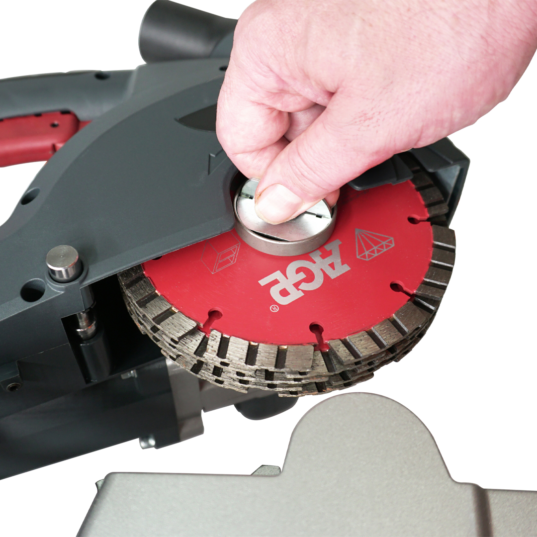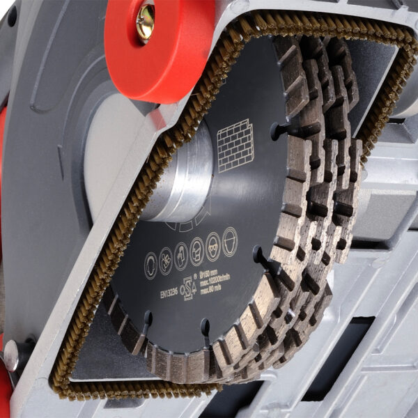 Slissemaskinen sikrer en effektiv arbeidsflyt med hele 2,5kW, med integrert mykstart og konstant hastighet. Maskinen er utstyrt med LED lampe som varsler ved eventuell overbelastning. Slissesagen leveres med 2 stk. diamantsagblader og avstandsstykker for både to og fem blader. Maskinen kommer med innebygd støvoppsamlingsbørste som effektivt holder på støv.