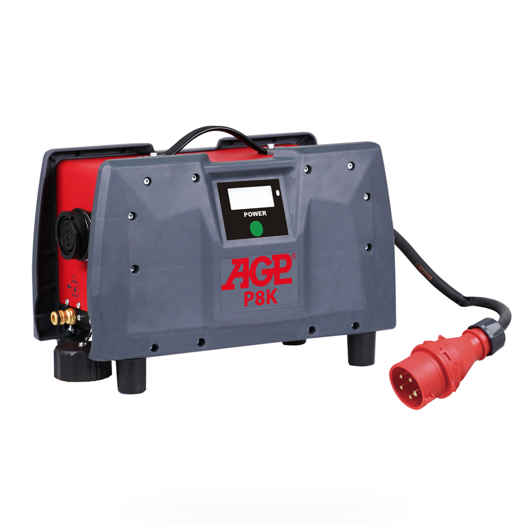 Den vannkjølte 8000W omformeren har innebygd PRCD beskyttelse, og kan benyttes med både 3-fas 400V, 3-fas 230V og 1-fas 230V. Den er utviklet for å drive alle våre høyfrekvensverktøy fra AGP (C406, C18, R16, CS18).  Omformeren har en LCD-skjermen som viser spenning, timer, feilkoder o.l.