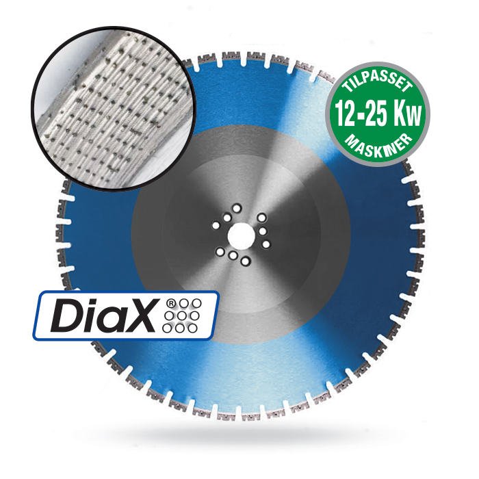 DIAX CROWN DC25 innehar nyutviklet diamantteknologi og er et profesjonelt sagblad med 3-dimensjonalt optimalisert diamantmatrise og hele 12 mm segmenthøyde. Dette sagbladet sikrer 100% overlegen skjærehastighet og levetid. mDobbeltsidig lasersveisede segmenter for optimal person sikkerhet i.h.h.t OSA. Krone formede segmenter, myk-medium binding, proppfullt av diamanter og leveres ferdig med hull for slett saging.