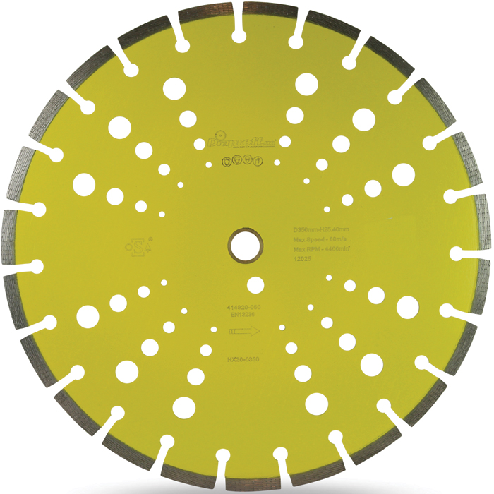 Super profesjonelt diamantsagblad med 3-dimensjonalt optimalisert diamantmatrise og 12 mm segmenthøyde sikrer 100% overlegen skjærehastighet og levetid. Dobbelsidig lasersveisede segmenter for optimal person sikkerhet i.h.h.t OSA og full ventilert bladstamme for maksimal kjøling og utkastelse av skjærestøv.