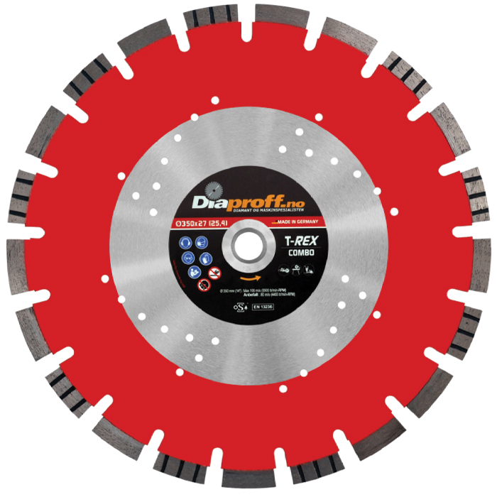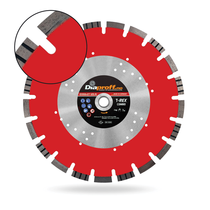 Nyutviklet kombi diamantblad med 10 mm segmenthøyde og 3 ulike diamantmatriser og segmenter for bruk på både betong – granitt og asfalt. Nedfelte støtte- og turbosegmenter for rask utkastelse av skjærestøv. T-REX Combo passer spesielt for deg som ikke ønsker å bytte sagblad i forhold til material valg. Perfekt for utleie bransjen.