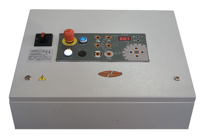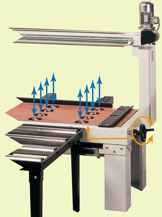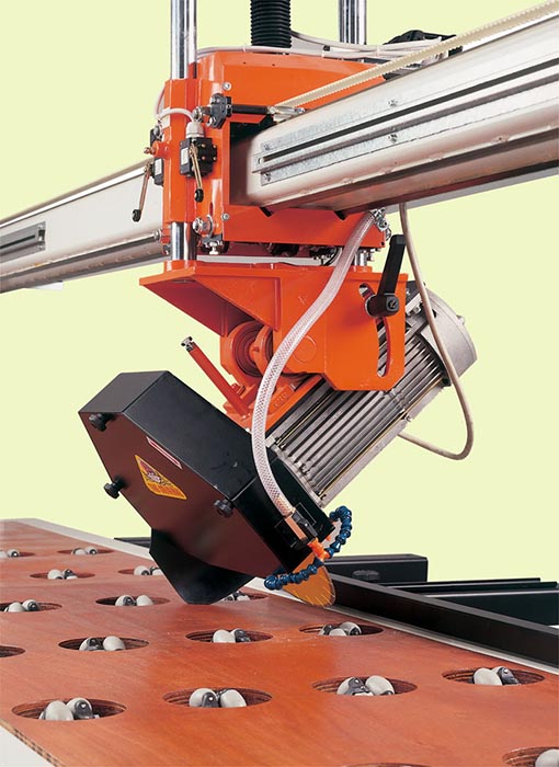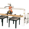 Utstyrt med en kryssfiner benk og med et løftesystem for multi posisjonering av stein plater gjør jobben enkelt og mer effektivt. Sagen utstyrt en elektrisk løfte- og senke funksjon, og elektrisk hastighetsregulatoren om justeres av operatøren. Hodet kan reguleres fra 90 til 45 grader for å muliggjøre kutt.