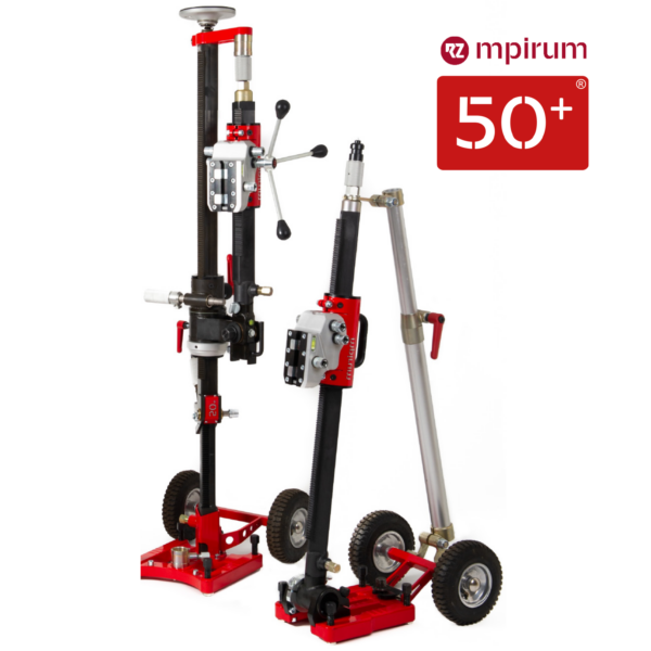 Stativ for stempling eller bolting. Førehus med universal hurtigkobling for kompakt og solid motorfesting. Hovedsøyle med tannstag og makshøyde 2975 mm som kan forlenges med ytterligere 145 / 495 /750 mm.