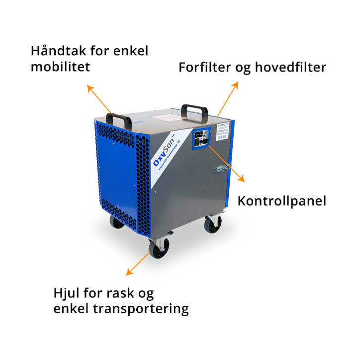 OxySan 4000 er vår største luftrenser, beregnet for rom inntil 1500 m³. Luftrenseren er helt fri for ozonfri, og renser effektivt luften for helseskadelige partikler som byggestøv, mikrostøv, bakterier, røyk o.l. Et unikt patentbeskyttet produkt som sørger for bedre luftkvalitet og en sunnere innemiljø på arbeidsplassen.